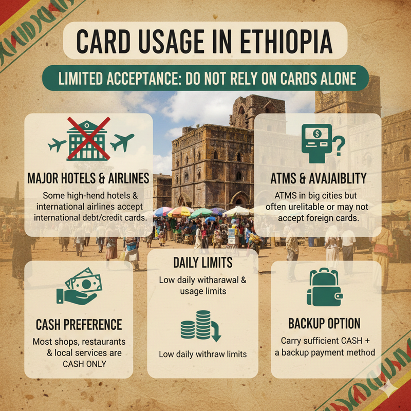 Card usage in Ethiopia is limited, so travelers should not rely on cards alone.